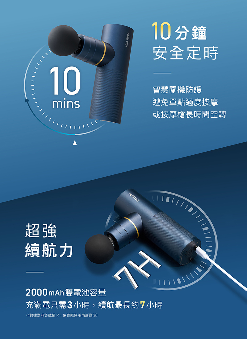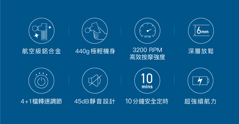按摩槍x1、充電線x1、 按摩頭x4、說明書x1、收納盒x1