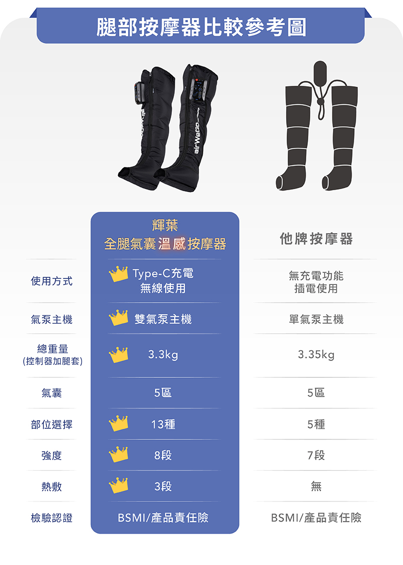 對比傳統腿部氣壓按摩用具,快速且有力的氣壓幫浦,更可以有效舒緩腿部循環