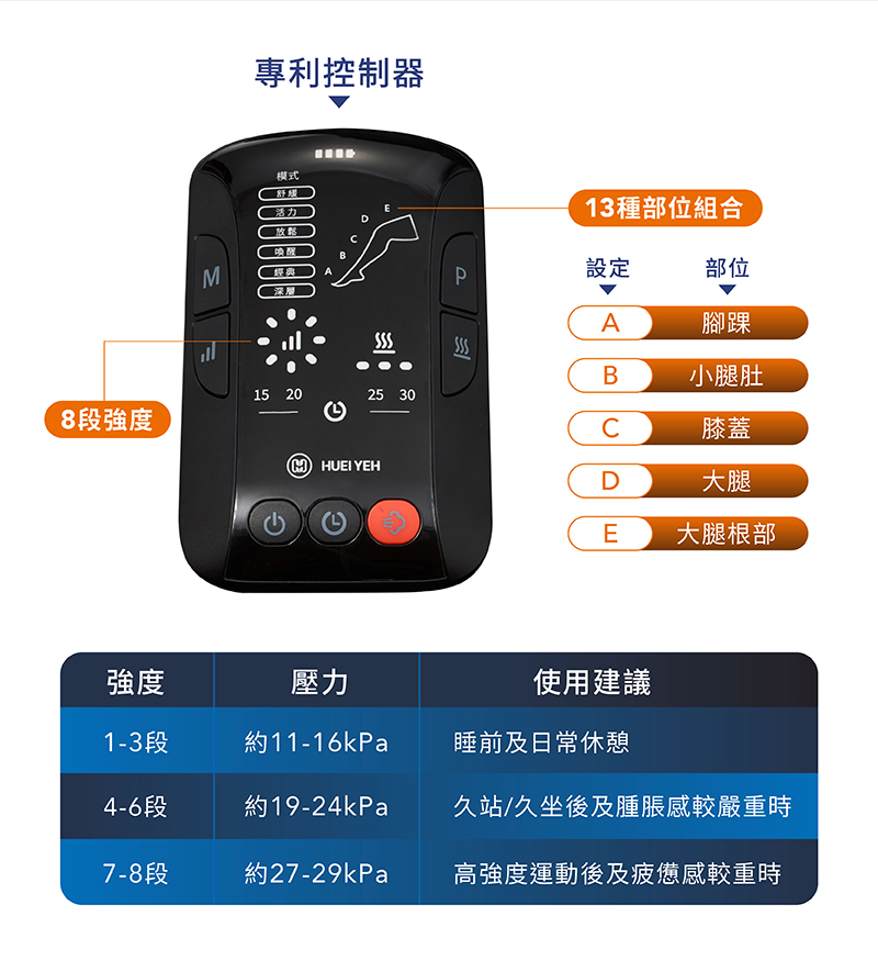 13種部位x8段強度選擇,搭配三段熱敷,體驗下半身輕盈感