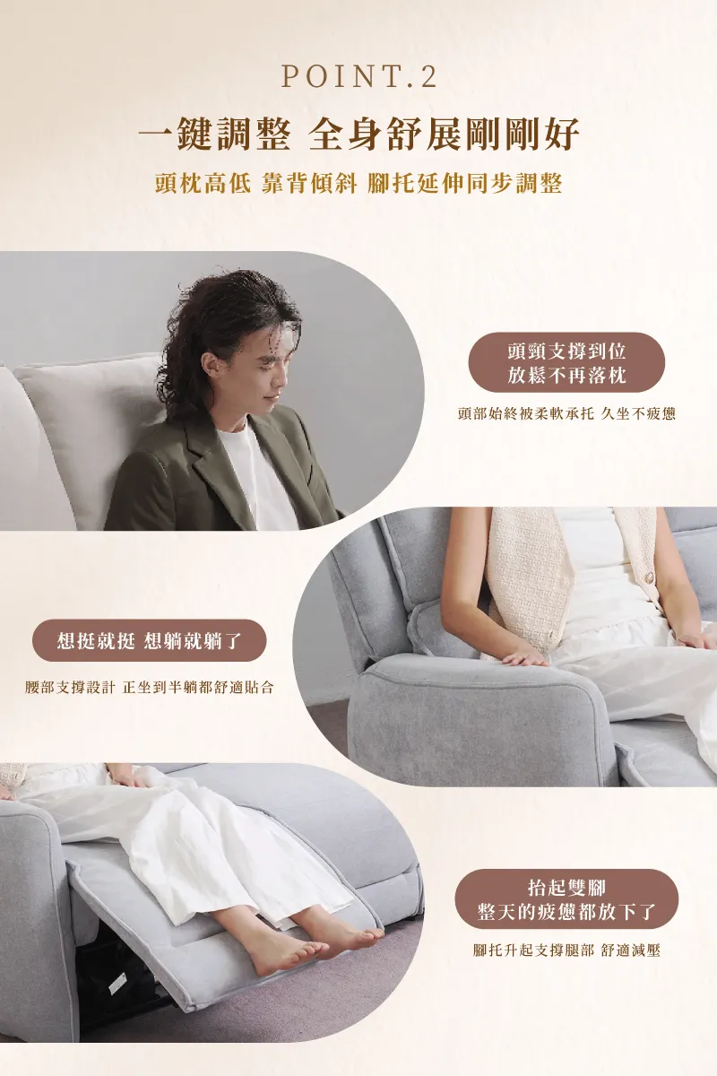 一鍵頭枕腳托同步啟動,全身舒展剛剛好
