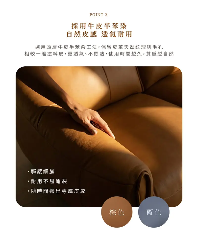 牛皮半苯染,觸感與耐用度兼具,採用十二項人工手檢,保留自然紋理更親膚舒適