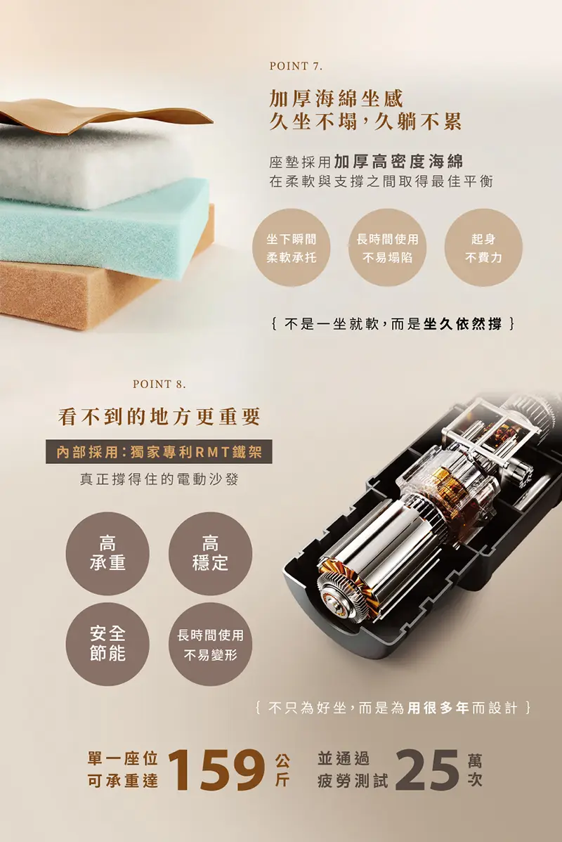 獨家專利的RMT鐵架,單一座位可承重159公斤,經過25萬次疲勞測試
