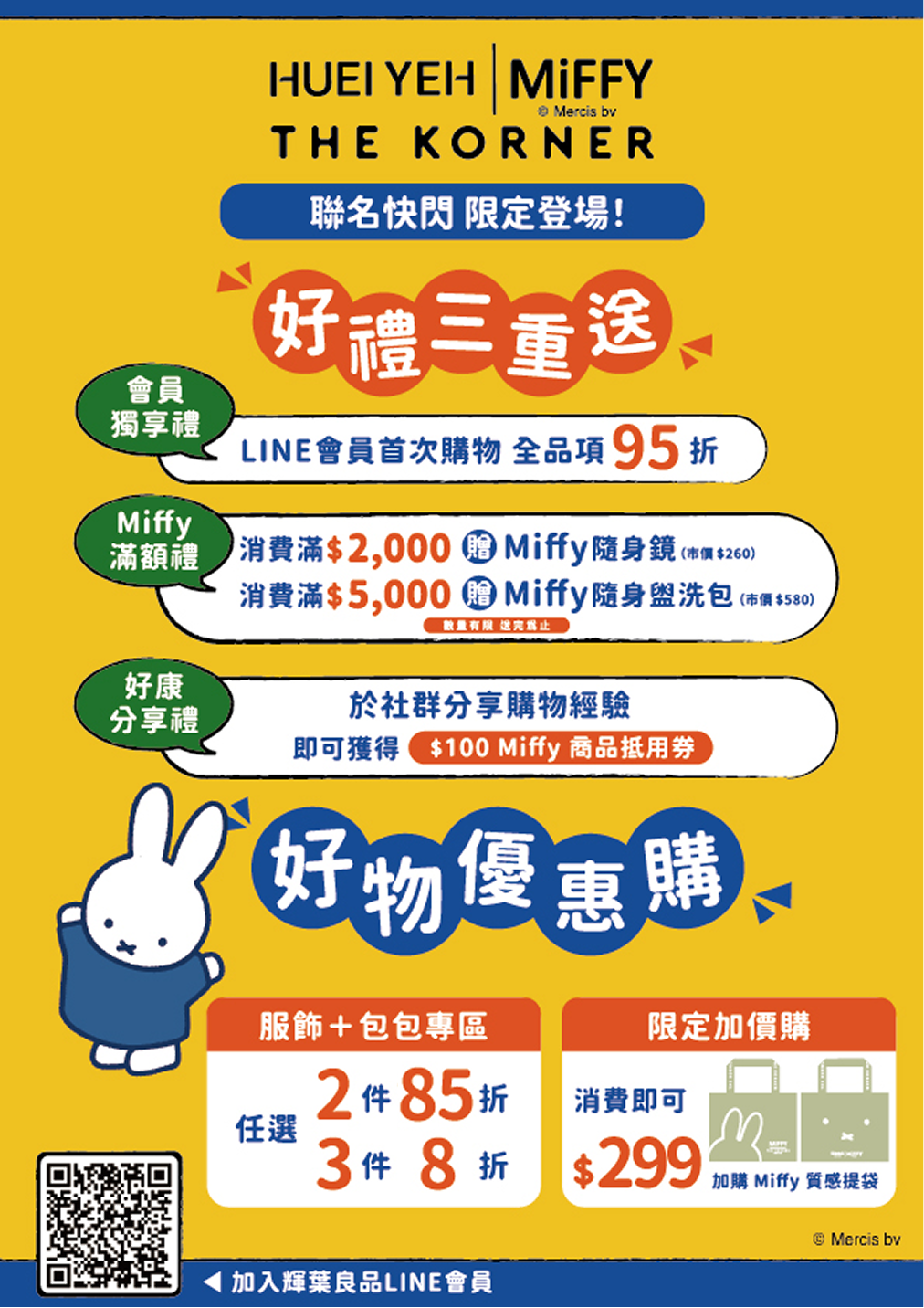 Miffy百元抵用券:只要於社群(FB/threads/IG 擇一)上分享在門市消費Miffy的購物體驗,並輸入 #輝葉良品有米菲,門市店員就會告知領取抵用券的通關密語囉
