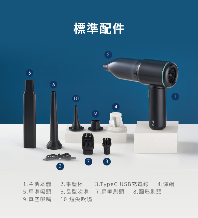 迷你吸塵器本體*1,集塵盒*1(已安裝在機身上),濾網*1(已安裝在機身上),Type-C充電線*1,扁嘴吸頭*1,長尖嘴吹頭*1,扁刷*1,圓刷*1,短尖吹嘴*1 ,真空吸頭*1,說明書*1